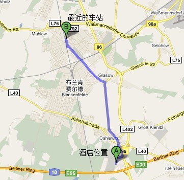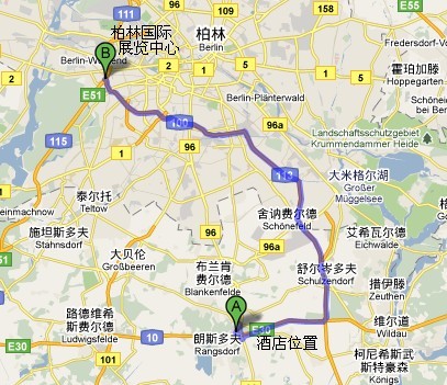 —A点为酒店位置,B点为“柏林电子展IFA”展馆位置;实际距离为44公里