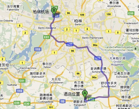 —A点为酒店位置,B点为“柏林机场”位置;实际距离为36公里