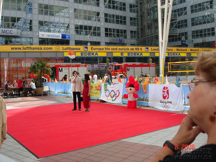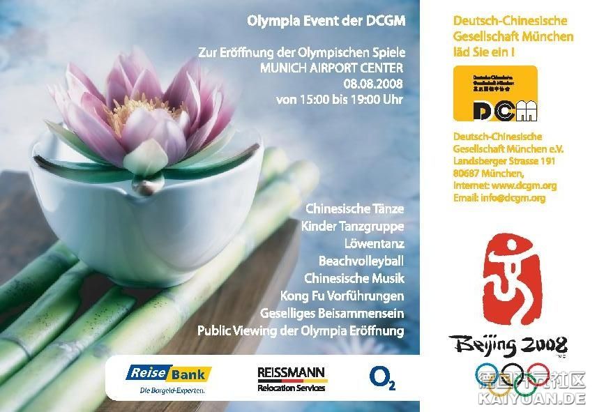 开元网与慕尼黑德中友协于2008年8月8日在北京奥运会开幕的同时,在慕尼黑机场举行庆祝活动。本次活动于当天的15至19点进行。中国艺术家的精彩表演赢得了观众的阵阵掌声。巴伐利亚州政府和中国驻德总领事馆的代表出席参加了活动并进行了发言。