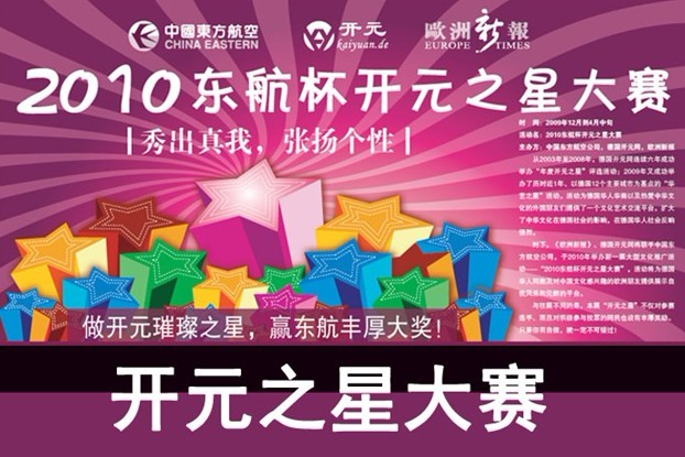 秀出真我,彰显个性。做开元璀璨之星,赢东航丰厚大奖!由中国东方航空公司,德国开元网,欧洲新报联合主办的2010 年东航杯开元之星大赛近日落下帷幕。参赛者通过撰写介绍自己的相关文字,添加个人图片,发表个人原创作品,上传展示自我爱好和才艺的音频,视频文件展示自己的实力与魅力,为自己增添人气。优胜者由大众网上投票产生并获得丰厚奖励。