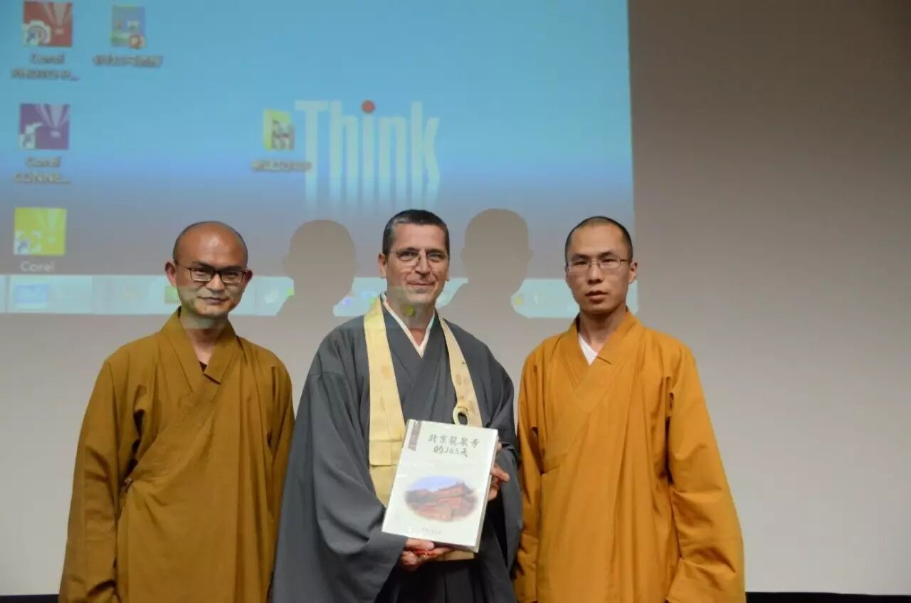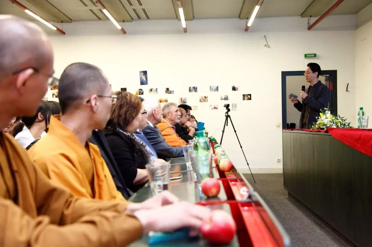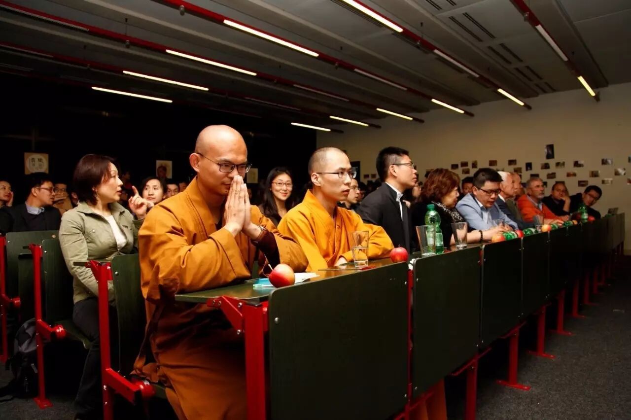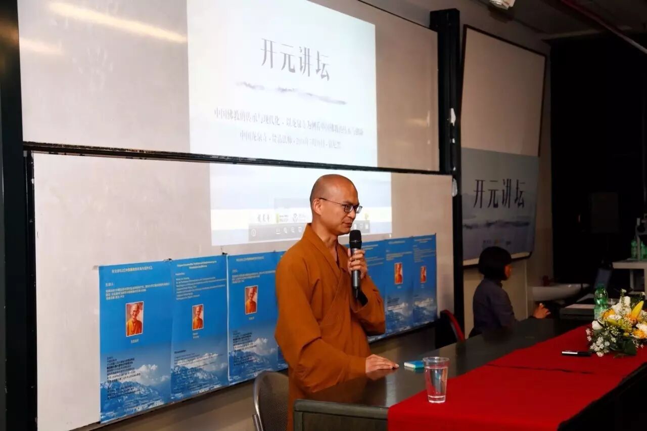 在播放了一段龙泉寺的介绍影片后,龙泉寺国际弘法事务执行长、荷兰龙泉大悲寺副住持贤清法师开始做题为《以龙泉寺为例看中国佛教的传承与创新》的主题讲座。与以往大家对佛教严肃刻板的印象有所不同,贤清法师讲起话来轻松幽默,平静的言语中处处透露着佛学的智慧。