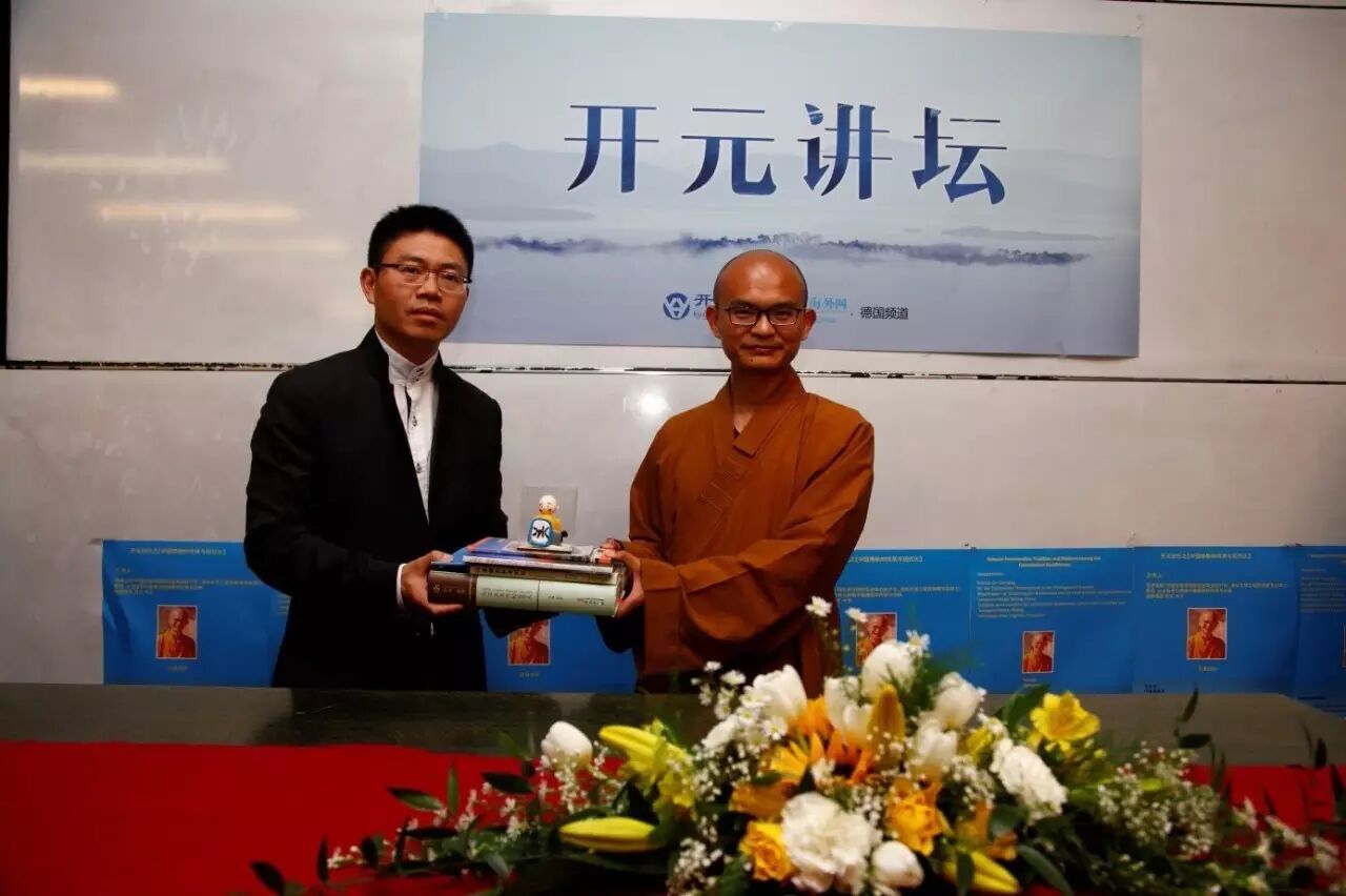演讲结束后,贤清法师向开元周游集团总裁周鸿图赠送了贤二玩偶和佛教书籍作为礼物。
