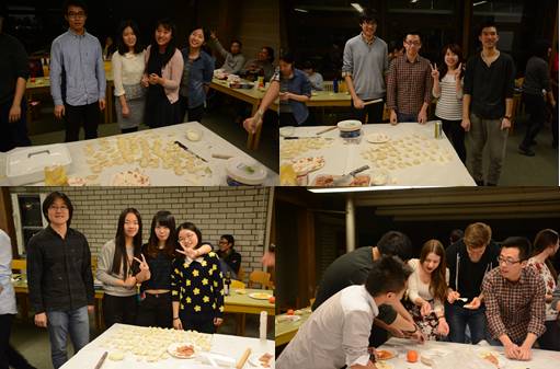 杯酒入腹尚不多,劝君先唱一首歌。献上对大家的新年祝福,王云龙同学作为“暖场歌手”首先为大家带来了一曲《今生共相伴》祝天下有情人终成眷属。开场环节结束,进入如火如荼的“包饺子大赛”环节。共有6组选手参加比赛,每组4人,限时15分钟,最后以完成的饺子数量与饺子“颜值”的乘积作为得分进行评比。最终周颖组技压群雄荣获冠军。带着胜利的喜悦,获奖队员开始为大家下饺子,同时进行“开元周游”现场微信互动抽奖环节。大家吃着饺子抽着奖,好不欢乐。