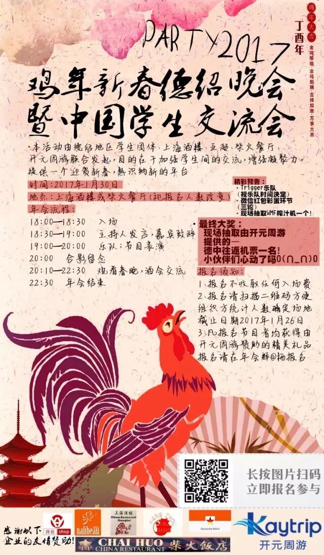 春雨将德绍的银装素裹冲淡,但依然挡不住大家的热情。在2017的1月30日这晚,我们欢庆年会。本次活动由德绍学生团体发起,开元周游、开元shop,及当地华人商体—德绍亚超、上海酒楼、柴火餐厅、杭州酒楼等都为本次活动提供了大力支持与赞助。活动从17:30开始,持续到22:00,晚会分为节目和PARTY酒会交流两个部分,美味佳肴和精彩纷呈的节目让这个夜晚不再寒冷。