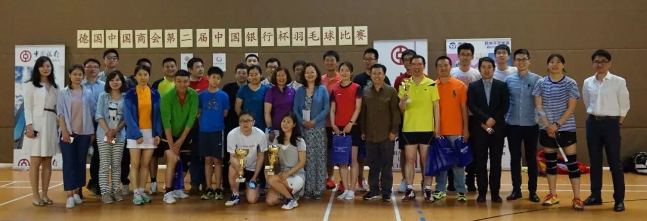 5月21日,由德国中国商会、中国银行慕尼黑分行和慕尼黑中国学联共同主办的第二届中国银行杯羽毛球比赛在慕尼黑宁芬堡羽毛球馆圆满落下帷幕。此届中国银行杯羽毛球赛得到了慕尼黑及其周边地区中资企业和我驻慕尼黑总领馆的热烈响应。中国驻慕尼黑总领事馆毛静秋总领事、德国中国商会蔡正欣主席、中国银行慕尼黑分行杨海泳总经理、各中资企业代表、我驻慕尼黑总领馆人员及慕尼黑中国学联代表60人,共18家企业参与此次活动。除此次活动冠名赞助商中国银行慕尼黑分行之外,惠州桦岭进出口贸易有限公司和开元周游集团还为赛事提供了友情赞助。