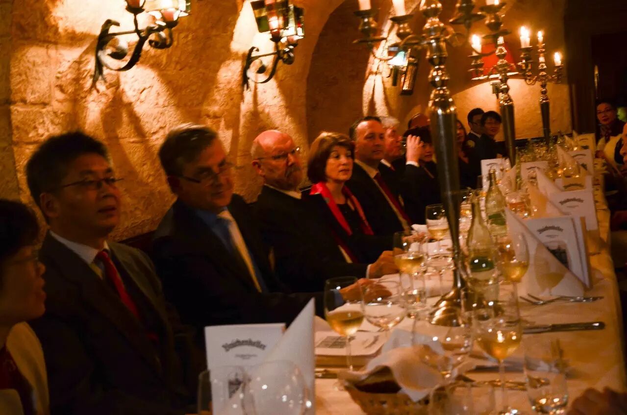 (海外网讯)2月12日晚法兰克福中国文化经贸服务中心在法兰克福著名的米其林两星级餐厅美茵桥酒窖(Brückenkeller)举办了第十届中国沙龙春节联欢会。中国驻法兰克福总领事馆的臧鸣和邹啸雪领事、原黑森州办公厅欧洲和国际事务司司长Michael Borchmann博士、黑森州经济部外贸处主任Norbert Noisser先生、德国侨联主席李阿平女士、法兰克福华茵中文学校校长王璟翎博士等60余名来自政治、经济、文化等各界人士济济一堂,身着节日盛装,共度中国沙龙春节联欢会。在农历猴年,中德将继续深化文化经济合作,共建新丝绸之路。
