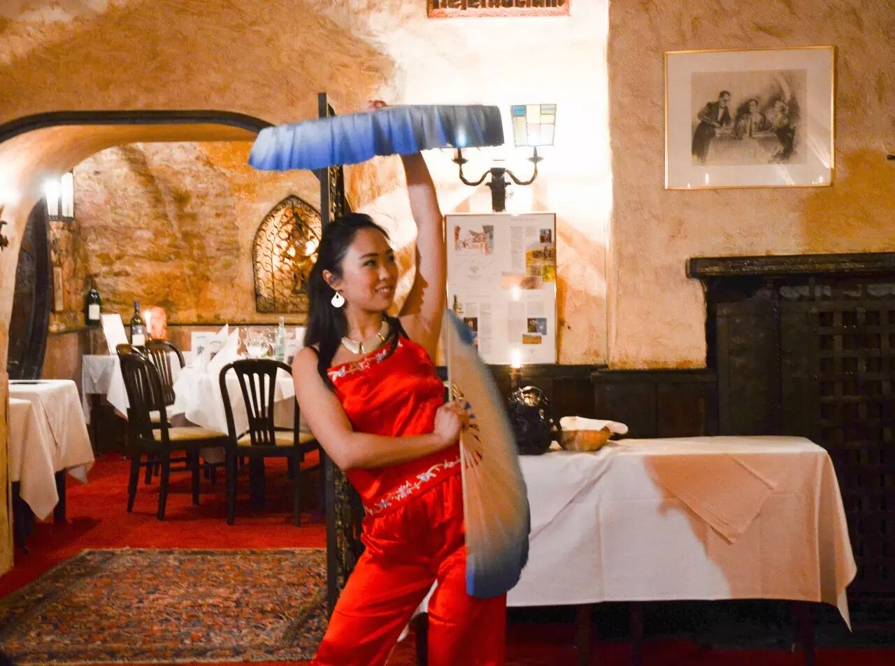 与往年一样,活动中穿插了富有中国特色的中国文艺表演。来自南京的叶林先生是一位来自法兰克福歌剧院交响乐团的小提琴音乐家,他以《新春乐》开场,在晚宴后表演的《新疆之春》和《渔舟唱晚》乐曲优雅、技艺精湛,将晚会推向了一个高潮。新疆是丝绸之路的必经之地,正好切合晚会的主题。此外,范琳靓小姐为大家表演的中国民族舞《云南花灯舞-螃蟹调》,节奏欢快,韵律甜美,生动地再现了一个在水边捉螃蟹的小姑娘的欢乐,赢得了在座宾客的频频掌声。