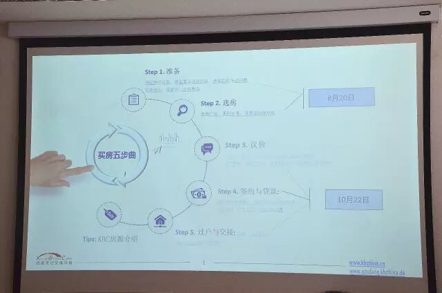 KBC负责人柳秀梅女士首先给大家介绍了在德购房置业的概况。她将买房分为五步——准备、选房、议价、签约贷款、过户交接,并从购房准备阶段的实际问题、选房的技巧和注意事项及议价等方面,侧重讲解了前三步。