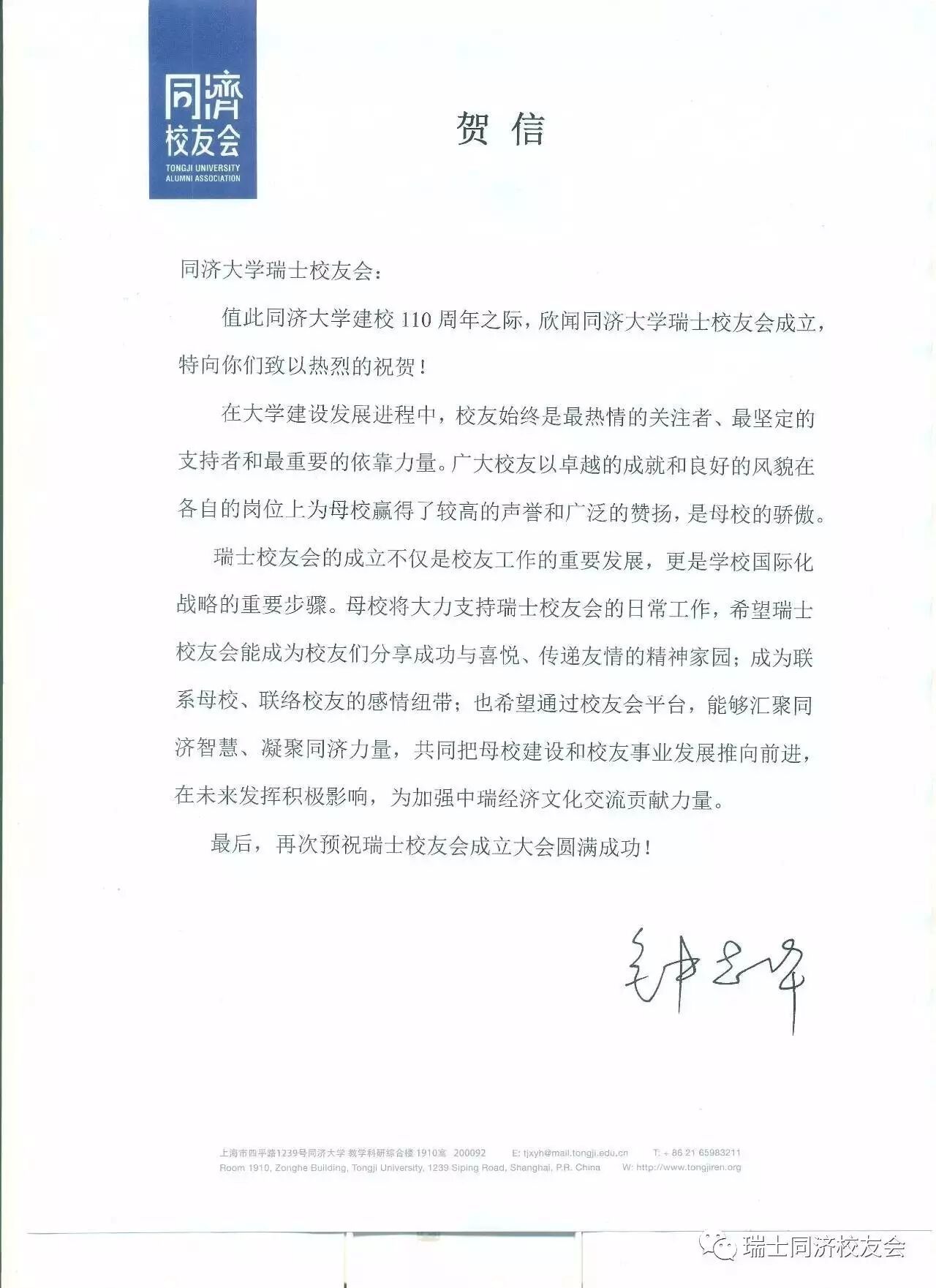 图4:同济大学钟志华校长在瑞士联邦校友会成立之际发来的贺信