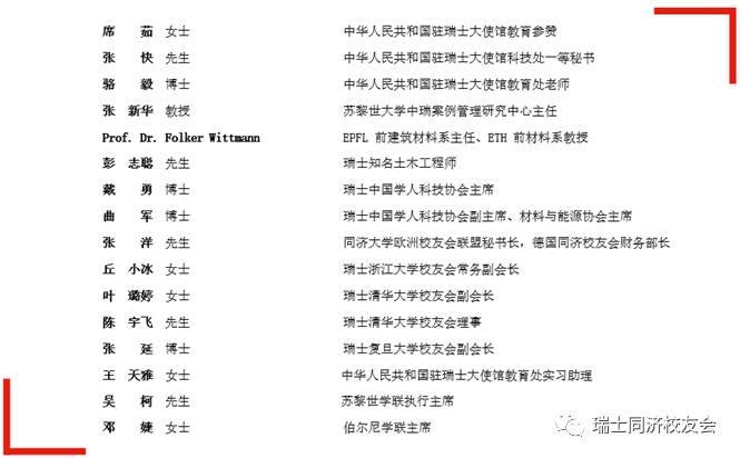 同济大学钟志华校长向校友会发来了成立贺信 (见附录图4) 以及在百忙之中录制的祝福视频 (见附录)。使馆科技处张快老师 (也是我们的校友)、使馆教育处骆毅老师和王天雅助理与使馆教育处席茹参赞一同出席了本次成立仪式。同济大学欧洲校友会联盟、德国同济校友会、瑞士科协、清华、北大、复旦、浙大等兄弟校友会和学联的嘉宾代表们也到现场表示祝贺。校友Prof. Dr. Folker H. Wittmann教授和张新华教授 (Prof. Xinhua Wittmann) 夫妇以及彭志聪先生还在成立仪式后为校友们分享了其在同济的经历、对同济精神的理解以及对世界和人生的体悟。创业校友Garben先生与姜燕女士向校友们介绍了其Limmatt名片夹设计并在现场抽奖赠送其产品。校友企业开元周游集团也为本次大会提供了抽奖礼品。