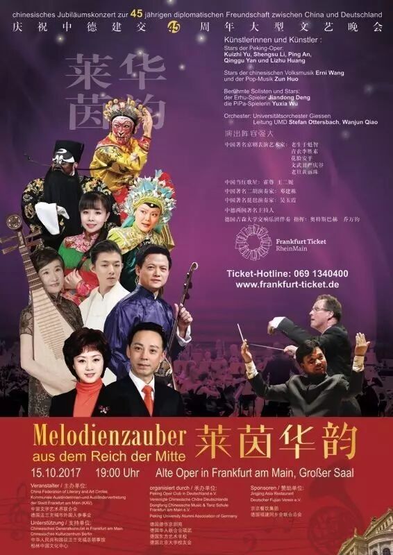 将于10月15日晚七点在法兰克福老歌剧院上演的晚会,是中国文学艺术界联合会(中国文联)最高规格的海外演出。演员阵容庞大,包括国内艺术家26人、德国交响乐团80人、华人合唱团150人、德国合唱团30人,以及德华京剧苑、东方艺术学校演员在内的300多人;大腕云集——于魁智(国家京剧院副院长、老生领军人)、李胜素(梅派传人)、王二妮、霍尊等9位国家一级演员登台献艺,吉森大学交响乐团伴奏,德国知名指挥家奥特斯巴赫和北美著名华人指挥乔万钧执棒。