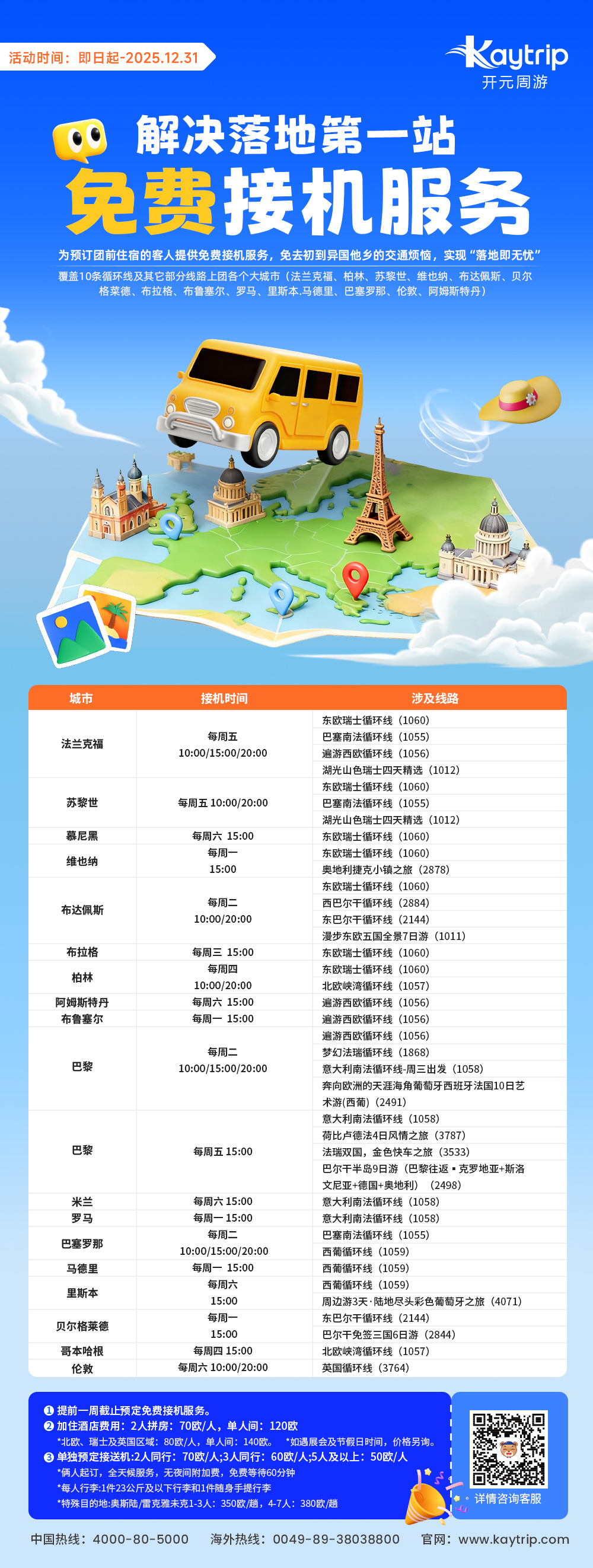 为预订团前住宿的客人提供免费接机服务,免去初到异国他乡的交通烦恼,实现“落地即无忧覆盖10条循环线及其它部分线路上团各个大城市(法兰克福、柏林、苏黎世、维也纳、布达佩斯、贝尔格菜德、布拉格、布鲁塞尔、罗马、里斯本.马德里、巴塞罗那、伦敦、阿姆斯特丹)