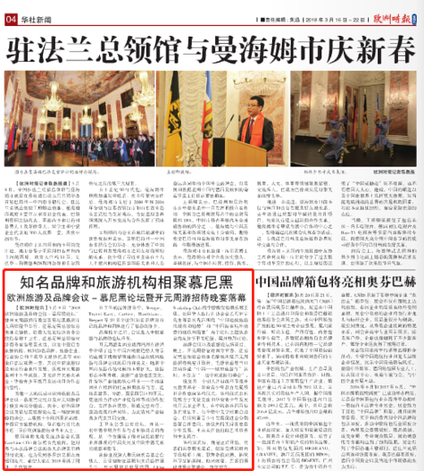 以此为背景, 通过各方的通力合作,2018年3月9日“2018欧洲旅游及品牌会议-慕尼黑论坛”及开元周游招待晚宴在慕尼黑威斯汀大酒店隆重举行,中国驻慕尼黑总领馆总领事毛静秋、中国驻德大使馆经济商务公使衔参赞王卫东、中国驻慕尼黑总领馆经济商务室参赞裴永贵,以及中德官方旅游机构、欧洲知名品牌、旅游企业、行业协会和主流华文媒体代表等400余位嘉宾欢聚一堂,共议中欧旅游以及相关行业良性发展,庆祝开元周游集团十五年成就,并见证开元慈善基金·华裔青少年教育发展项目合作意向签约。