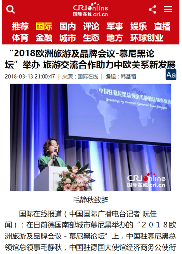 “国之交在于民相亲;民相亲在于心相通”,在中国发展和中欧关系进入新时代的今天,我们不仅需要经贸领域进一步加强合作,更需要通过加强旅游、文化等多个领域的交流合作,促进民众的相互了解和认知,减少误解和分歧,夯实中欧整体合作民意基础,推动中欧、中德关系再上新台阶。2017年是“中德旅游年”,2018是李克强总理和欧盟委员会主席容克共同指定的“中国—欧盟旅游年”,正如中国驻德大使馆经济商务公使衔参赞王卫东所肯定的,2018欧洲旅游及品牌会议-慕尼黑论坛”暨开元周游招待晚宴除了有加强旅游业界交流、促进行业合作发展的直接作用,更重要的是还有便利和加强民间交往和沟通,促进双方更全面更深入合作的深远意义!