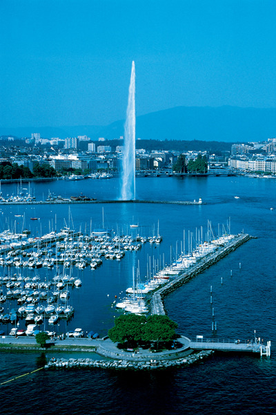 日内瓦湖 (法方称莱芒湖) 是阿尔卑斯湖群中最大的一个。湖面形状略似新月,月缺部分与法国东部衔接,湖水漪涟,烟霞万顷,波面似镜,碧蓝清澈。天鹅和水禽搏戏水上,游艇和彩帆游弋湖中。群群白鸽在湖畔倘佯,和平宁静。日内瓦湖中,最引人注目的是一个巨大的人工喷泉,冲天而起的高大水柱,从湖面直射天际,蔚为壮观。