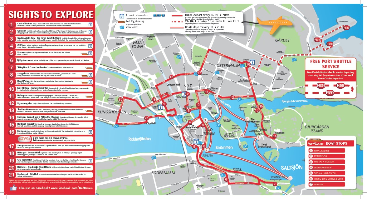 巴士和船只不改道可直接到达的景点包含斯堪森公园、皇宫、Gröna Lund 主题公园、瓦萨博物馆、峡湾街、市政厅、Abba 博物馆、冰吧、老城区及数个热门购物区。