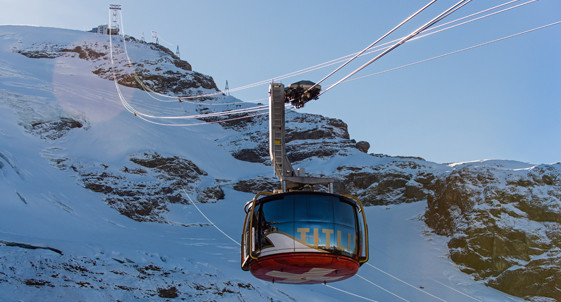 搭乘8人座铁力士山快线缆车从英格堡站(Engelberg)出发,抵达Stand中间站。换乘铁力士山旋转缆车登上海拔3020米的山顶缆车站。
