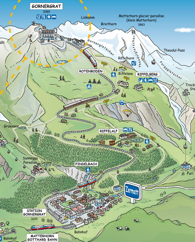无论是上山或下山,不妨选择其中一趟在沿途稍作停留,徒步或骑脚踏车。尤其夏季的利菲尔湖(Riffelsee)波平如镜、清澈见底,倒映马特宏峰,是采尔马特最经典的美景,很多采尔马特宣传手册上的照片都是在此地拍摄;冬季可以从利菲尔贝格(Riffelberg)下车,沿着小径到冰川花园,或从罗腾博登(Rotenboden)下车,体验穿越冰川的活动,找寻冰川的源头,一路到达位于冰川上方的罗莎山小屋休憩,感受纯净无污染的大自然。位在海拔2,795米的罗莎山小屋(Monte Rosa Hutte)原建立于1895年,现已改建成一座环保且外型如水晶巨石的建筑,提供130间客房及宽广的景观阳台,为旅人提供难忘的阿尔卑斯山之旅。
