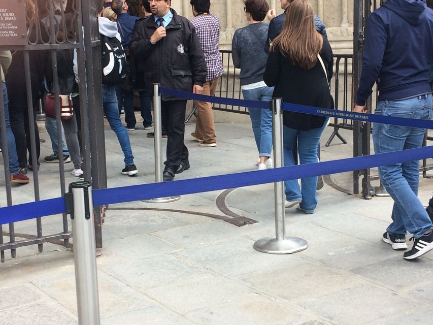 3.在圣母院面前,您会在大教堂的右边看到一个现场排队的长队伍,在队伍的旁边,您会发现在左边有一个用蓝色警戒线隔开的短队伍。这是您进入参观的免排队入口