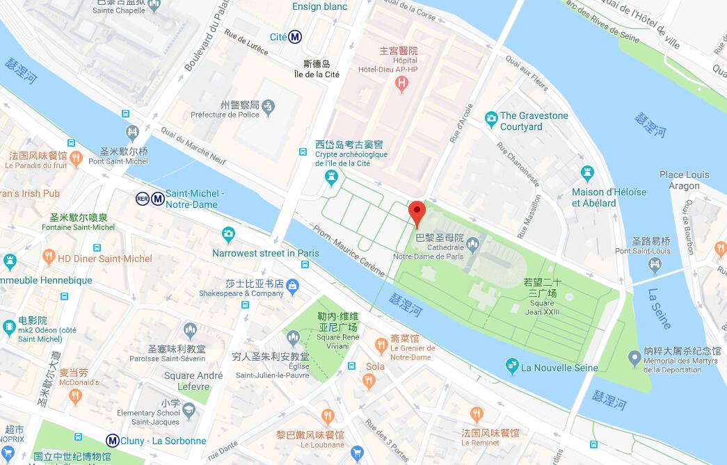 之后,您可以去外面欣赏大教堂的雕像, 雕像由两扇巨大木门让您进入教堂内部,同时您还可以看见著名的石像鬼,继续游览,您将前往拉丁区,穿过双桥 (Pont au Double) 来到蒙特贝罗 (Quai de Montebello),绕过勒内 · 维维亚尼广场 (Place René Viviani),您将沿路来到索邦街区历史悠久的穷人圣朱利安 (Saint-Julien-le-Pauvre) 路,您会看到位于圣雅克 (Rue Saint Jacques) 路的圣塞弗林教堂 (Church of Saint Séverin),之后来到加兰德路 (Rue Galande) 结束您的旅程,最后请您将语音导游设备带回大教堂接待处。