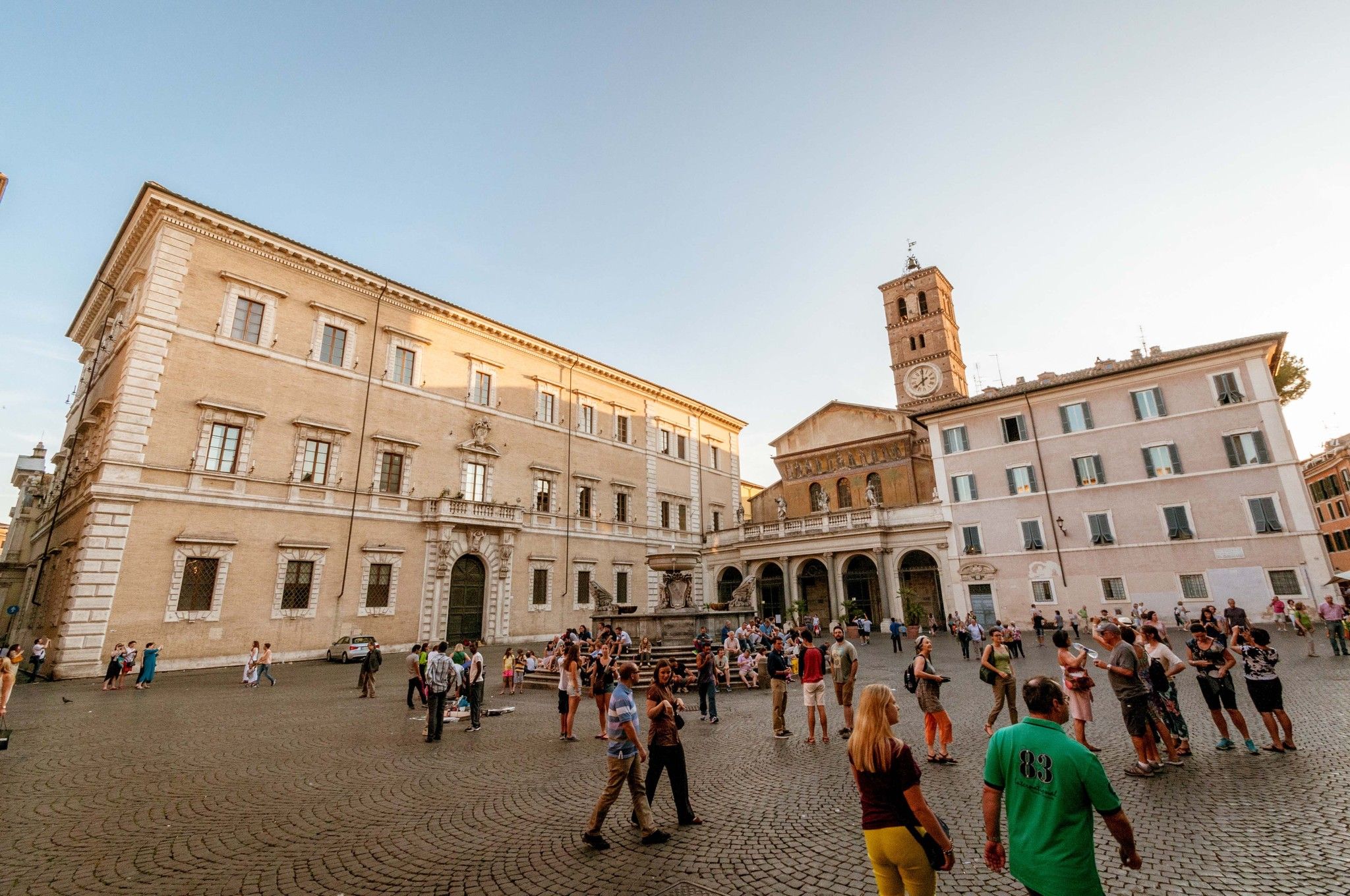 到达圣塞西莉亚大教堂,建在那里的罗马烈士张柏芝在今年220死去的地方继续前行,沿着鹅卵石铺就的街道步行到达广场的圣玛丽亚,邻里的心脏,和一个伟大的地方日常见证生活。