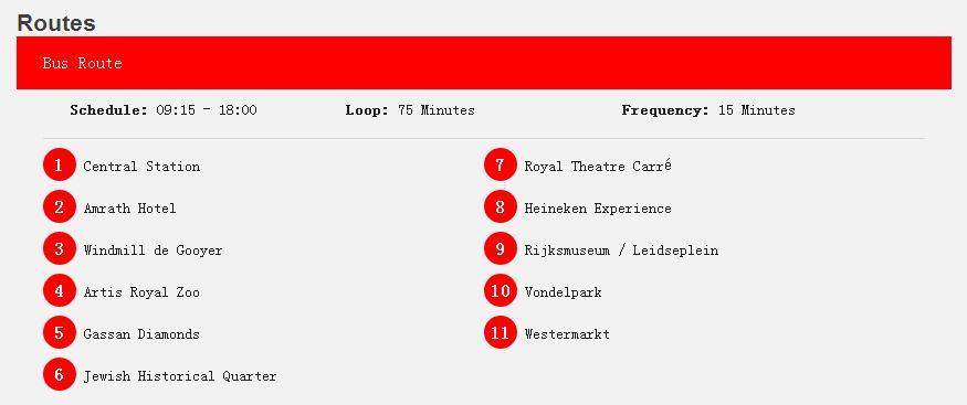 路线:Central Station - Amrath Hotel - Windmill/East - Artis Royal Zoo - Gassan Diamonds - Jewish Historical Museum - Heineken Experience - Museum Square - Stadhouderskade - Vondelpark - Wester Market - Amsterdam Museum - Central Station