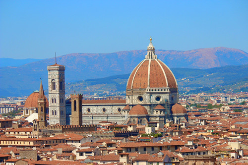 圣母百花大教堂是世界五大教堂之一。佛罗伦萨在意大利语中意味花之都。大诗人徐志摩把它译作“翡冷翠”,这个译名远远比另一个译名“佛罗伦萨”来的更富诗意,更多色彩,也更符合古城的气质。教堂位于意大利佛罗伦萨历史中心城区,教堂建筑群由大教堂、钟塔与洗礼堂构成,1982年作为佛罗伦萨历史中心的一部分被列入世界文化遗产。这座使用白、红、绿三色花岗岩贴面的美丽教堂将文艺复兴时代所推崇的古典、优雅、自由诠释得淋漓尽致,难怪会被命名为“花之圣母”。教堂圆顶内部是瓦萨里所绘制的穹顶画《末日审判》,大厅墙壁上有壁画《乔凡尼·阿古托纪念碑》和为纪念但丁诞辰200年所绘的《但丁与神曲》,浮雕比比皆是。登上教堂北侧的463级台阶到达圆屋顶,可以俯瞰整个佛罗伦萨老城区的街景。