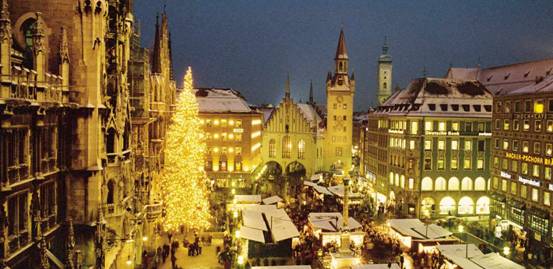 西方世界有许多节庆活动都起源于德国,比如装饰圣诞树和降临节日历。而对于德国人来 说,众多活动里传统圣诞市场的魅力最为难以抗拒。在慕尼黑,圣诞市场的习俗已经延续了600多年。每年这里都会变成冬季乐园,挤满了诱人的摊位,售卖各种 传统装饰品,到处都是愉快的气氛,空气中充满了烤坚果和热酒的香味。