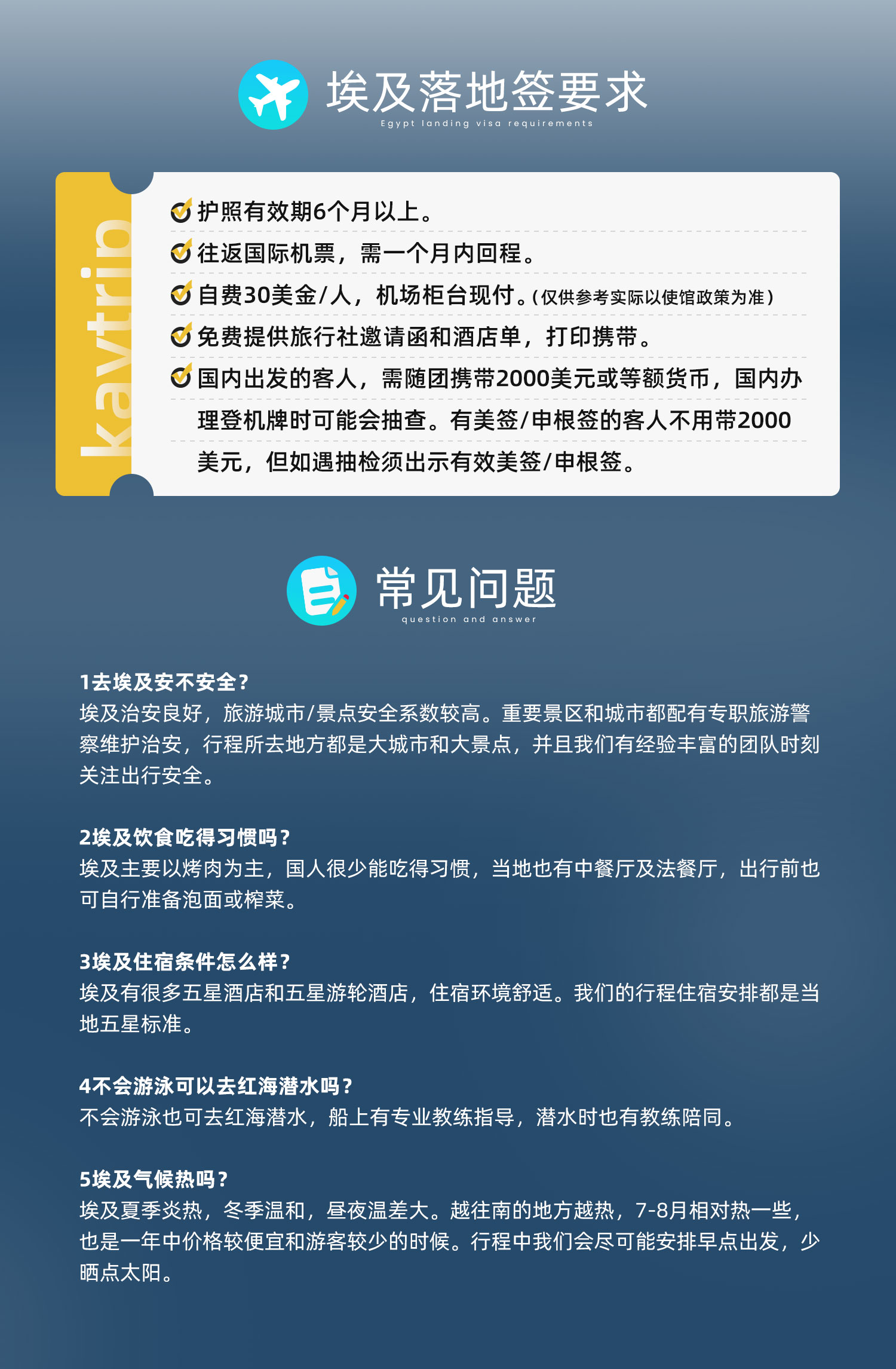 6)埃及客观条件与国内旅游无法相提并论,整体服务水平和硬件设施与国内旅游存在一定差异,敬请理解。