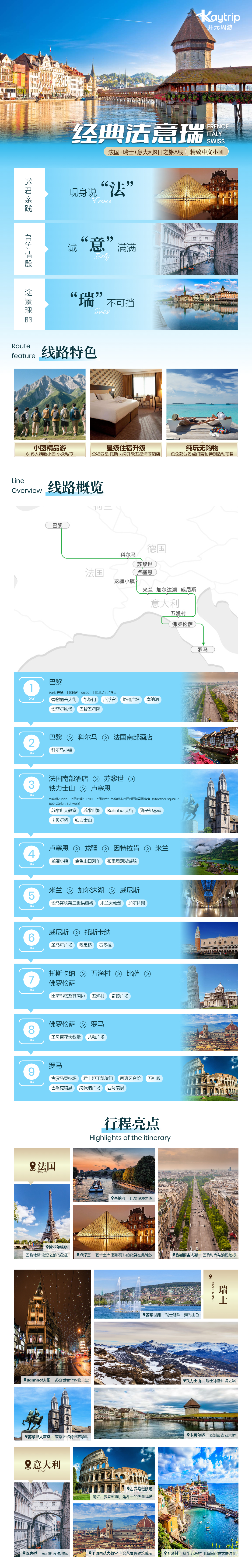 行程索要:巴黎-科尔马-法国南部酒店-苏黎世-铁力士山-卢塞恩-龙疆-因特拉肯-米兰-加尔达湖-威尼斯-托斯卡纳-五渔村-比萨-佛罗伦萨-罗马