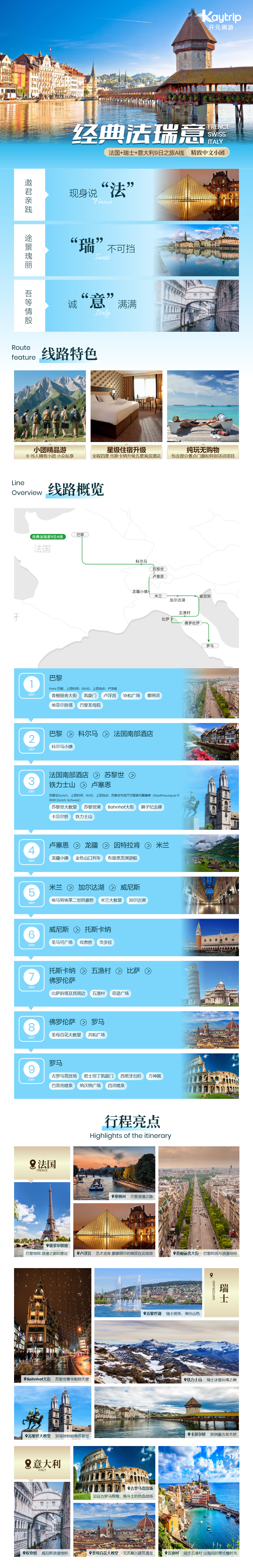 行程索要:巴黎-科尔马-法国南部酒店-苏黎世-铁力士山-卢塞恩-龙疆-因特拉肯-米兰-加尔达湖-威尼斯-托斯卡纳-五渔村-比萨-佛罗伦萨-罗马