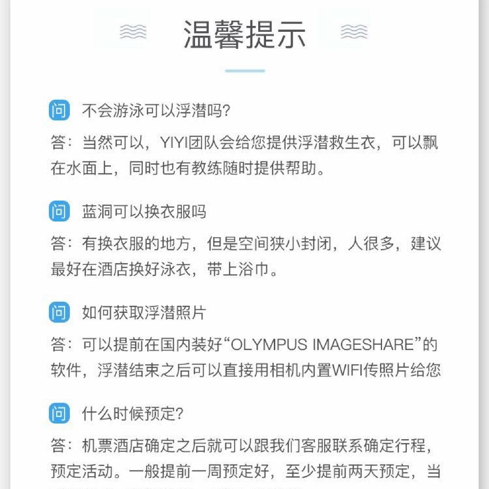 *照片获取:建议提前下载“OLYMPUS IMAGESHARE”的软件,浮潜结束后可以直接用相机内置WIFI传输照片给您