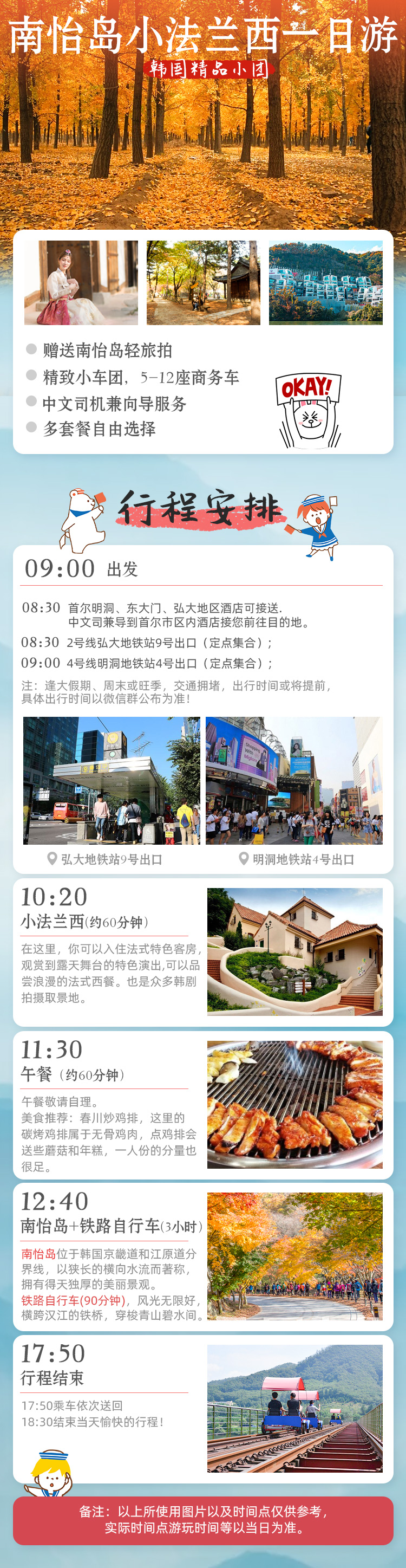 4)含门票(小法兰西,南怡岛渡轮,自行车) 注:如不可抗力因素或个人原因不体验,费用不退。