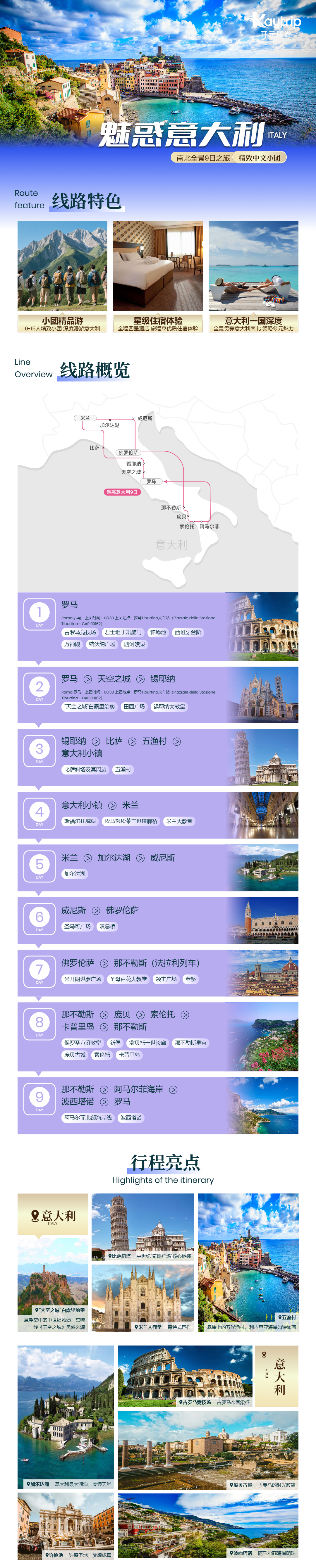 路线名称:【2026年】魅惑意大利▪南北全景9日之旅【精致中文小团】< 罗马上下> ; 意大利9日跟团游轻奢线·【锡耶纳大教堂+白露里治奥+比萨斜塔+奇迹广场+五渔村+加尔达湖+米兰大教堂+埃马努埃莱二世拱廊桥+圣母百花大教堂+领主广场+叹息桥+贡多拉+保罗圣方济教堂+新堡+阿马尔菲海岸+索伦托+庞贝古城+古罗马竞技场+君士坦丁凯旋门+许愿池+西班牙广场】 [ 欧洲旅游, 精致小团 ]