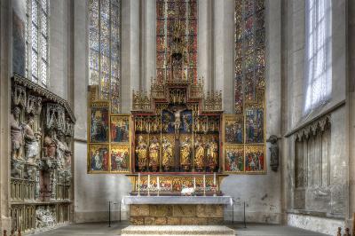 圣雅各福音路德教区教堂(建于1311年至1485年间)坐落于罗滕堡的克林根街和克洛斯特街交汇处,教堂内珍藏着众多艺术瑰宝。在这座罗滕堡最重要的教堂中,西侧廊厅陈列着由维尔茨堡木雕家蒂尔曼·里门施奈德于1500年左右为圣血圣物雕刻的著名圣血祭坛。同样值得一看的还有弗里德里希·赫林于1466年创作的十二使徒祭坛:祭坛背面描绘了罗滕堡城的最早景象,以及罕见的圣雅各之路朝圣者图文故事。清晨的阳光洒在东侧唱诗班席位上,拥有600年历史的彩色玻璃窗呈现出令人叹为观止的绚丽色彩!