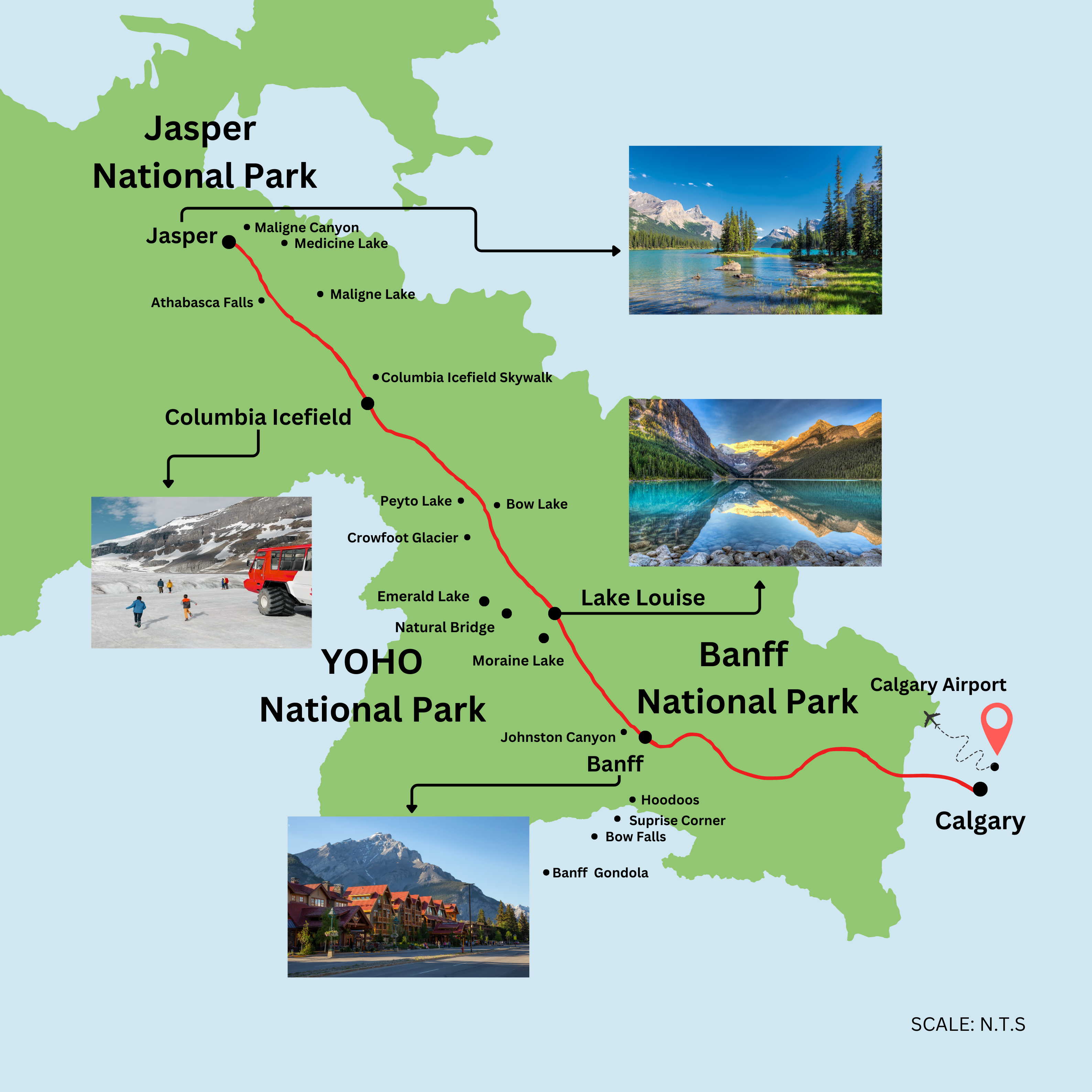 共3个上下车地点 卡尔加里-班夫国家公园-贾斯珀国家公园-路易斯湖-优鹤国家公园-卡尔加里
