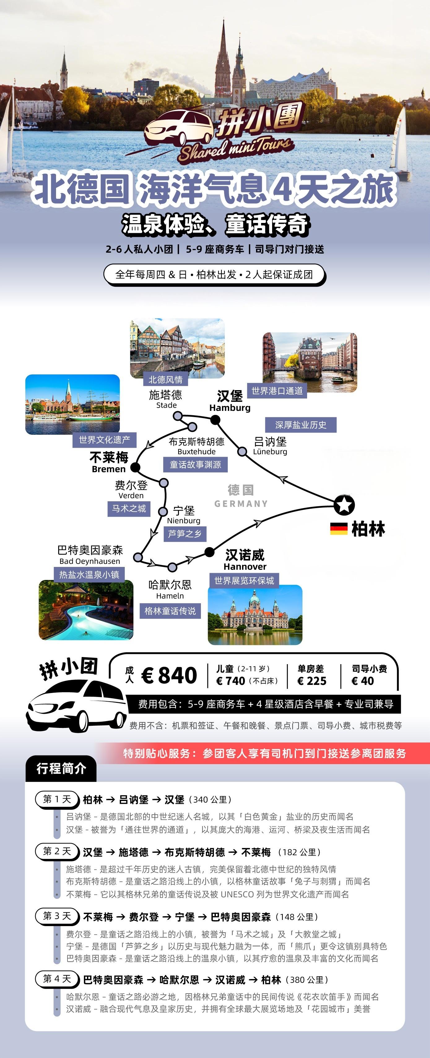 拼小团不接受单人报名,2人起发,1人报名需支付2人费用。,每周四、日柏林发团
