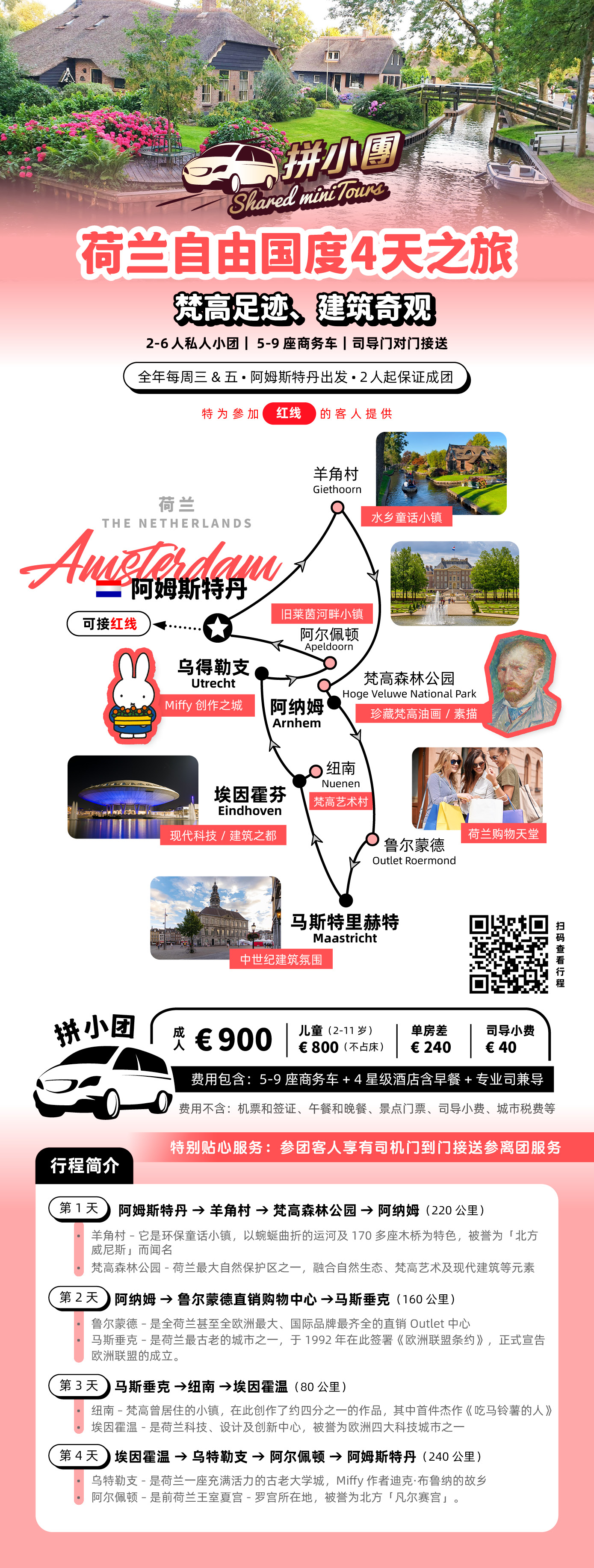 路线名称:【拼小团】荷兰自由国度4天3晚(阿姆斯特丹往返) ; [ 欧洲旅游, 拼小团 ]