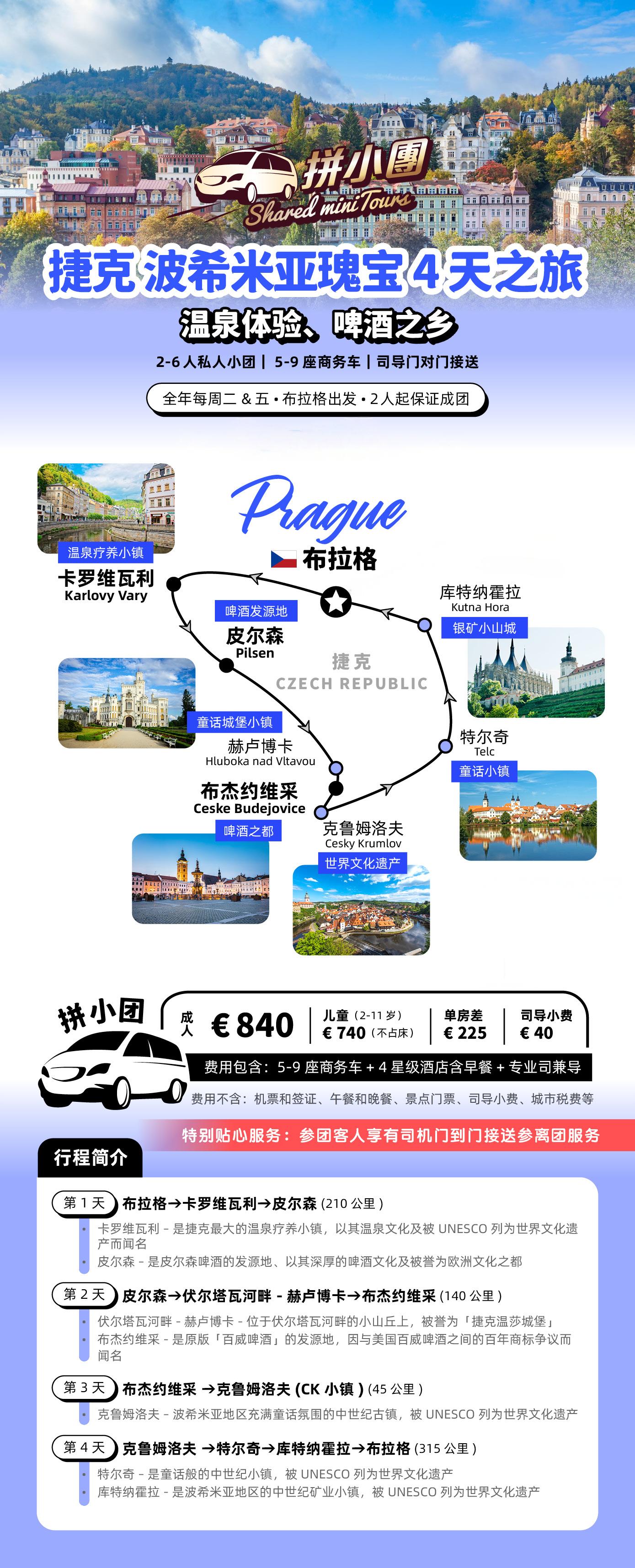 共2个上下车地点 布拉格-卡罗维瓦利-皮尔森-伏尔塔瓦河畔-赫卢博卡-布杰约维采-克鲁姆洛夫-特尔奇-库特纳霍拉-布拉格