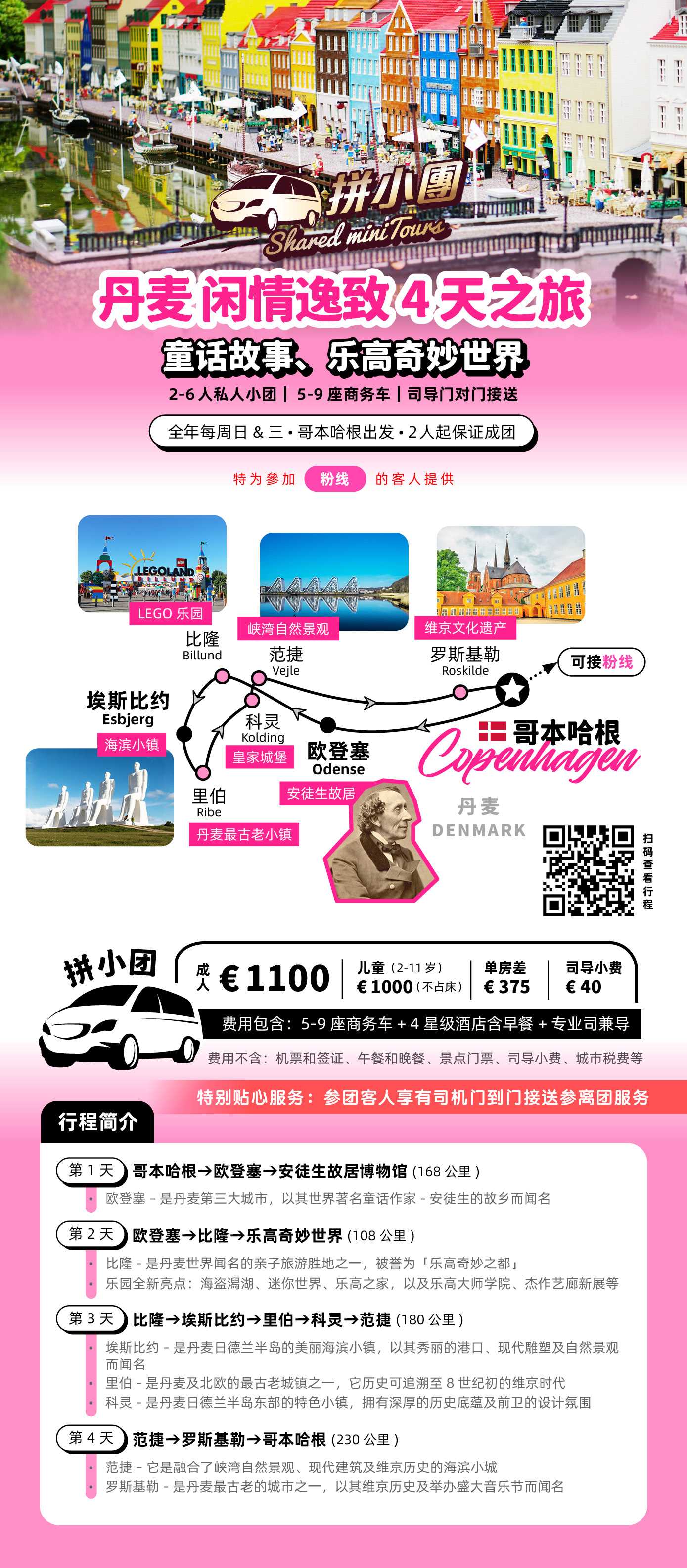 拼小团不接受单人报名,2人起发,1人报名需支付2人费用。,每周日、三哥本哈根发团。